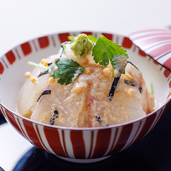 魚料理のプロ監修の若水謹製、天然真鯛切り身のお茶漬け。昆布締めで濃厚な味わいに仕上げ、胡麻だれが絶妙なハーモニー。絶品のお茶漬けです。