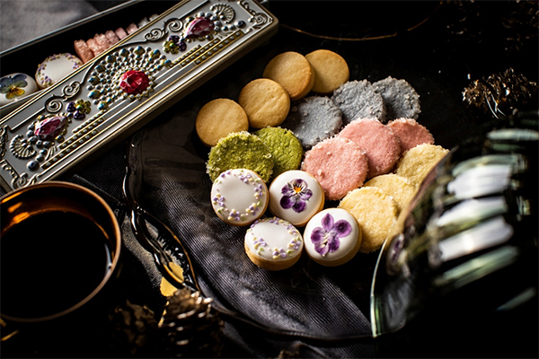 すみれのエディブルフラワーをあしらったアイシングクッキー、すみれの小花柄のアイシングクッキー、ビーツ、紫芋、すみれ、抹茶、レモンの5種類のフレーバーのディアマンクッキー、バタークッキーのセットです。